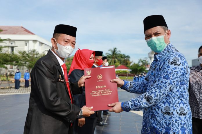 REPUBLIKNEWS.CO.ID,PALOPO – Sekretaris kota (Sekkot) Palopo, Drs. Firmanza DP, SH.,M.Si mewakili Walikota Palopo menyerahkan secara simbolis SK CPNS Formasi Umum Tahun 2019 kota Palopo dan tanda kehormatan Satyalancana Karya Satya X, XX dan XXX tahun di Halaman Kantor Walikota Palopo pada saat apel pagi, Jumat (15/1/2021).