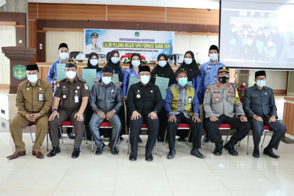 Penyerahan SK CPNS yang dilakukan oleh Bupati Luwu Timur, Irwan Bachri Syam, secara simbolis ini dihadiri Anggota DPRD Luwu Timur, unsur Forkopimda, Perwakilan Kepala Kantor BKN Regional IV Makassar, Asisten, Kepala OPD lingkup Pemkab Lutim dan seluruh CPNS tahun 2019 melalui aplikasi zoom meeting.