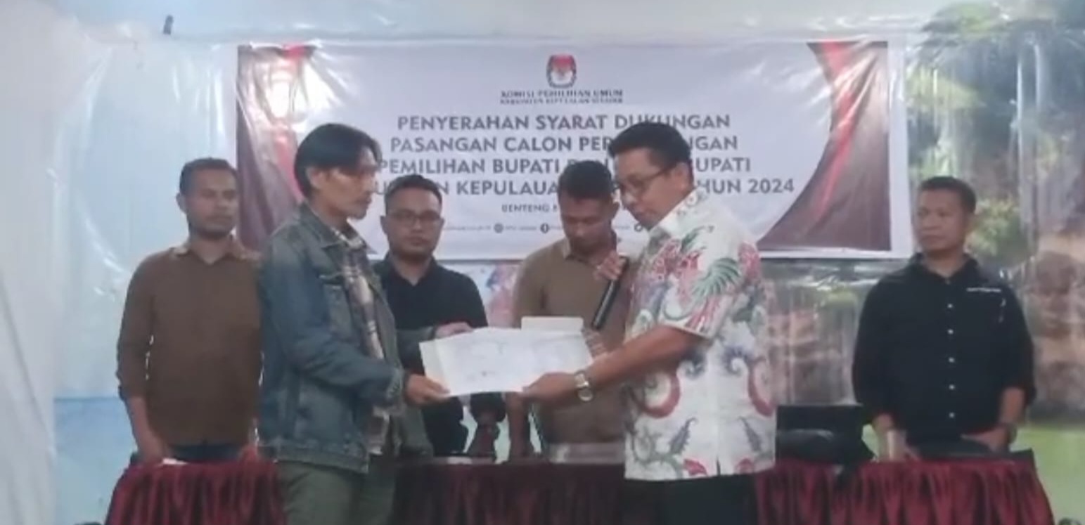 Andi Fajar selaku LO menyerahkan langsung berkas dukungan bakal calon perseorangan kepada Ketua KPU Kepulauan Selayar, Andi Dewantara di Aula Dekranasda, Jalan Jenderal Sudirman Nomor 01 Kota Benteng Selayar, Minggu malam (12/05/2024).