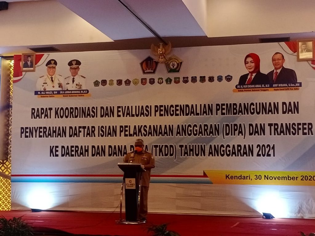 REPUBLIKNEWS.CO.ID, Kendari – Gubernur Sulawesi Tenggara Ali Mazi menyerahkan dokumen Daftar Isian Pelaksanaan Anggaran (DIPA) dan Transfer ke Daerah dan Dana Desa (TKDD) Tahun Anggaran 2021 kepada satuan kerja (Satker) dan Pemerintah Kabupaten/Kota se-Sulawesi Tenggara, di Hotel Claro, Senin (30/11/2020).