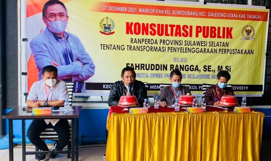REPUBLIKNEWS.CO.ID, TAKALAR – Anggota DPRD Provinsi Sulsel, Fahruddin Rangga kembali melaksanakan kegiatan konsultasi publik terhadap rancangan propemperda transformasi penyelenggaraan perpustakaan di Keluraham Bontolempangan, Kecamatan Galesong Utara, Kabupaten Takalar, Senin (27/12/2021) kemarin.
