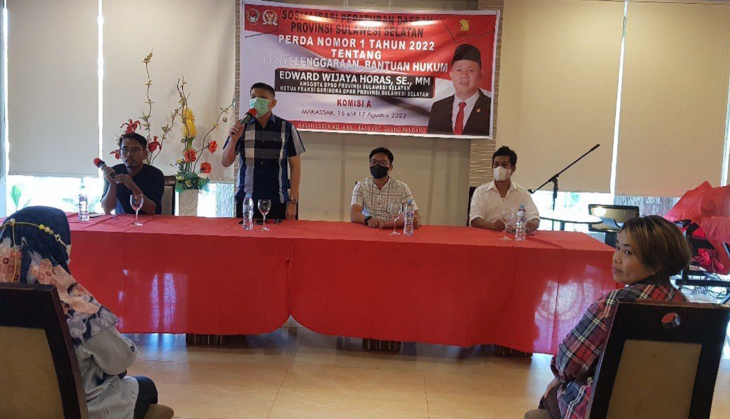 REPUBLIKNEWS.CO.ID, MAKASSAR – Anggota DPRD Sulawesi Selatan, Edward Wijaya Horas menggelar sosialisasi Peraturan Daerah (Perda) Provinsi Sulawesi Selatan Nomor 1 Tahun 2022 tentang Penyelenggaraan Bantuan Hukum. Kegiatan ini dihelat di RM Golden Suki, Jalan Sultan Hasanuddin, Kelurahan Baru, Kecamatan Ujung Pandang, Kota Makassar, Rabu (17/8/2022).