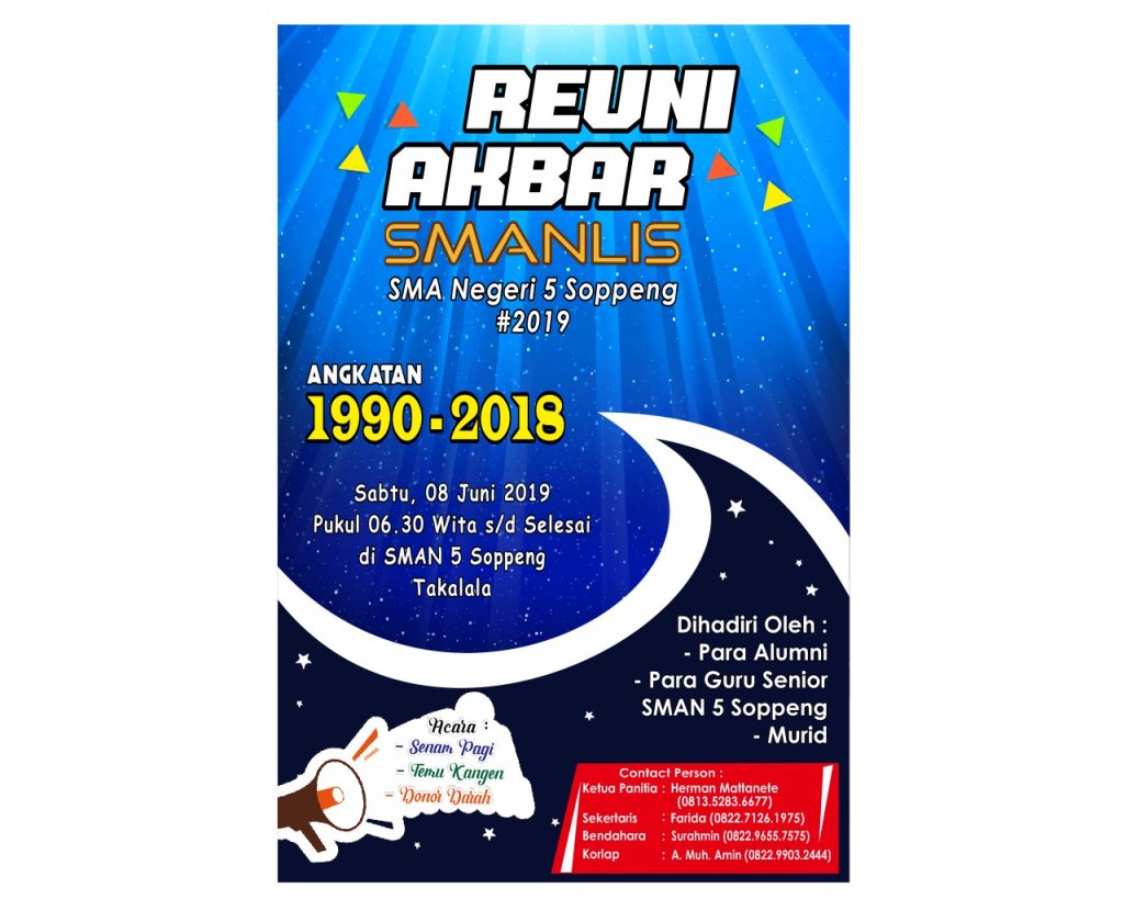 REPUBLIKNEWS.CO.ID, SOPPENG — Sekolah Menengah Atas (SMA) Negeri Takalala atau SMAN 5 Soppeng, Kecamatan Marioriwawo Kabupaten Soppeng akan menggelar Reuni Akbar di halaman Sekolahnya, pada Sabtu (08/06/2019) mendatang.