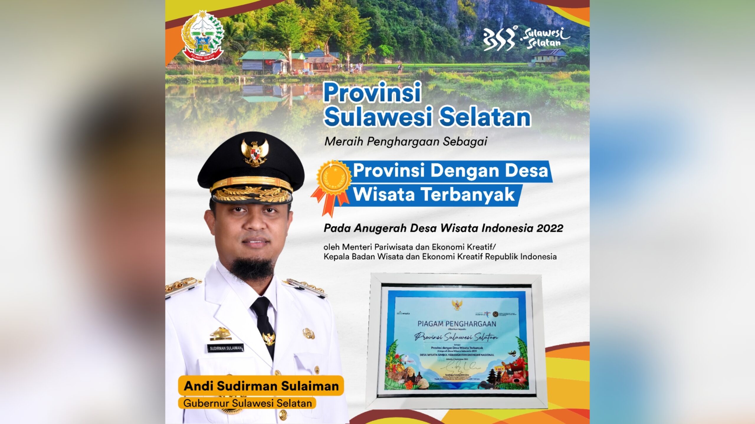 “Alhamdulillah, Sulsel sebagai Provinsi dengan desa wisata terbanyak pada Anugerah desa wisata Indonesia 2022,” kata Kepala Dinas Kebudayaan dan Pariwisata (Disbudpar) Sulsel, Muh. Jufri, Senin (3/10/2022).