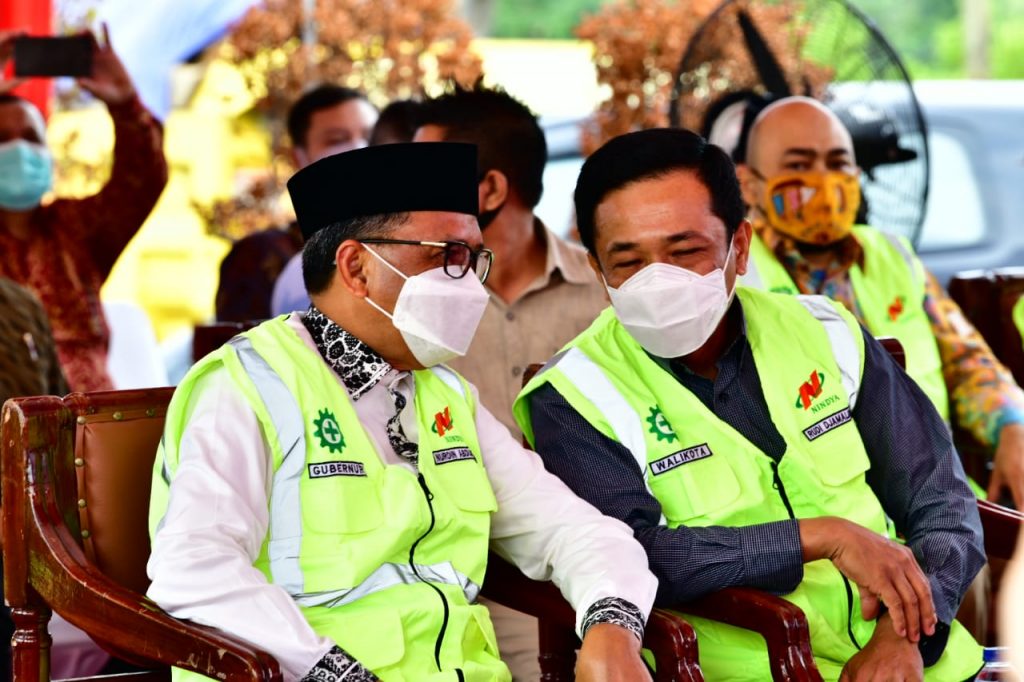 Gubernur Sulsel Prof. Nurdin Abdullah, berbincang dengan Pj Wali Kota Makassar Prof. Rudy Djamaluddin saat Ground breaking paket pekerja Konstruksi Pedesterian Trotoar Metro Tanjung Bunga, Sabtu (24/10/2020).