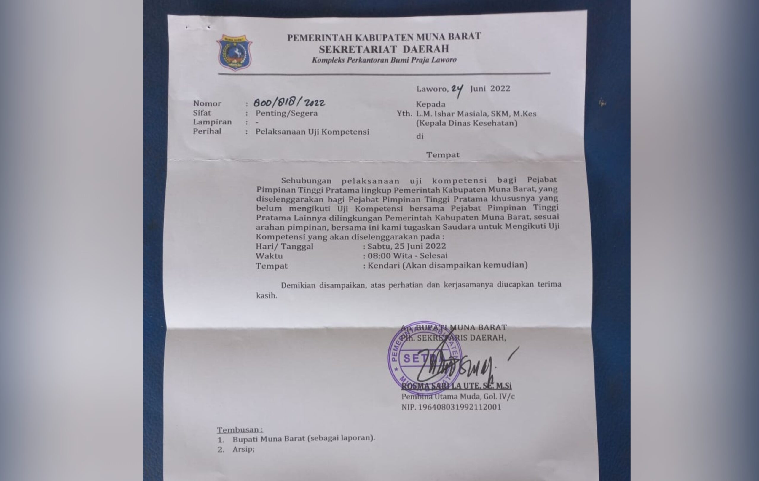 Asisten II Pelaksana Harian (Plh) Sekda Pemkab Muna Barat Rosma Sari Laute, Jumat (24/06/2022) kemarin, memanggil tiga pejabat eselon II yakni Kepala Dinas Kesehatan, Kepala Dinas Pendidikan dan Kebudayaan serta Kepala Dinas Pemuda dan Olahraga untuk mengikuti uji kompetensi yang dilaksanakan di Kota Kendari, Sabtu (25/06/2022).