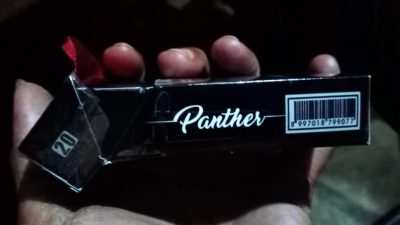 Rokok filter cigarrettes isi 20 batang yang bermerek Panther produksi PR.DPT Soppeng-Indonesia diduga Ilegal karena tidak menempelkan pita cukai.