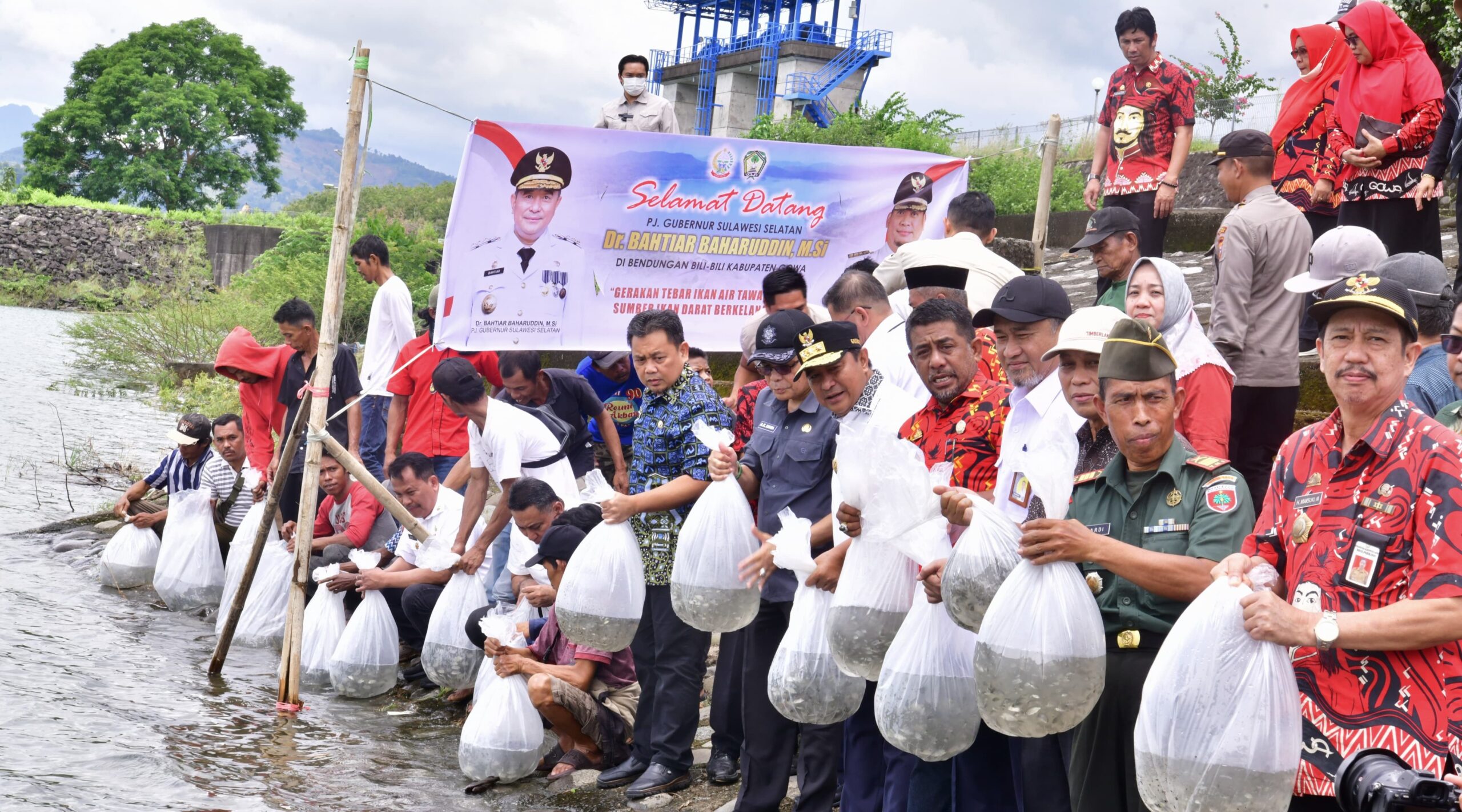 REPUBLIKNEWS.CO.ID, GOWA — Penjabat Gubernur Sulsel Bahtiar Baharuddin, menebar 100 ribu benih ikan di Bendungan Bili-bili, Kabupaten Gowa, Kamis (04/04/2024). Ia pun mengajak seluruh warga sekitar bendungan agar sama-sama merawat bendungan tersebut, agar fungsinya tetap sama pada saat awal dibangun.