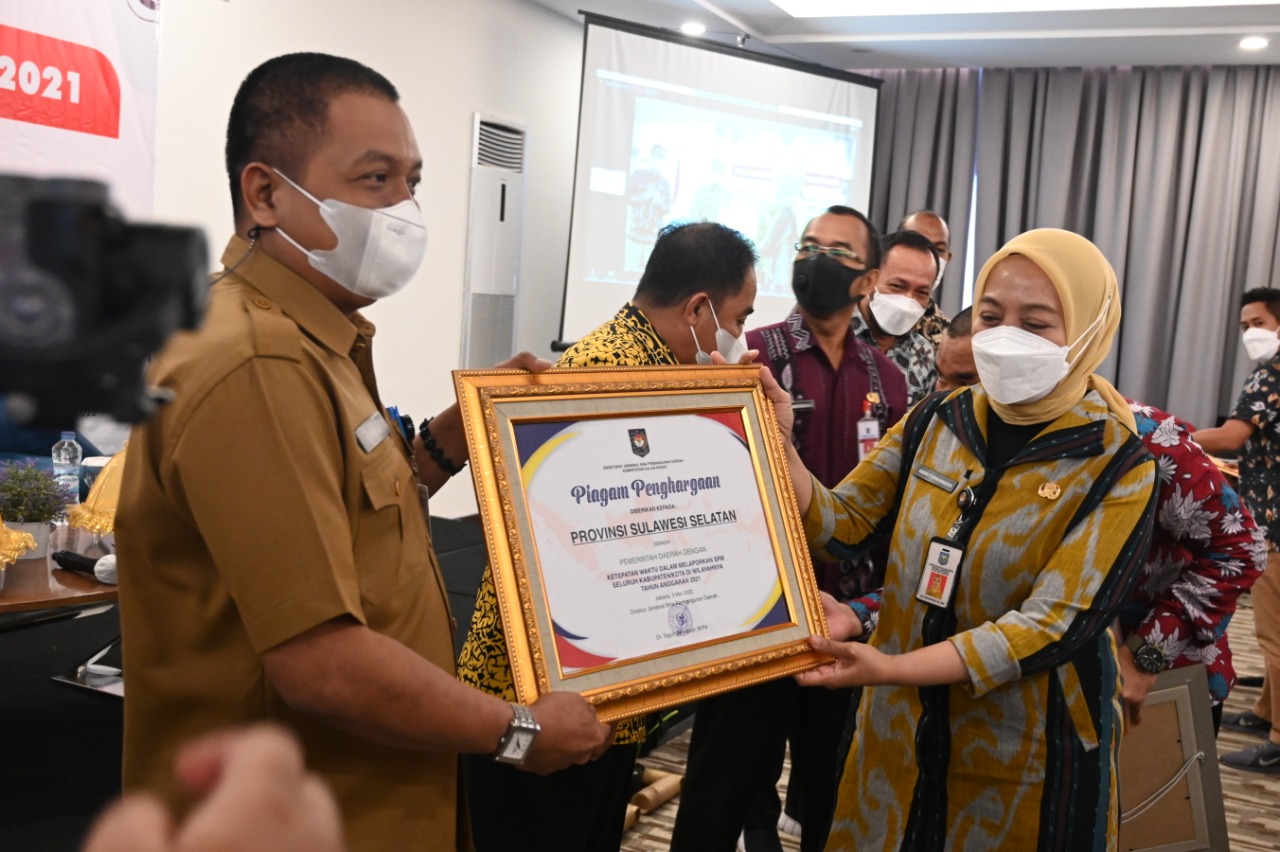 Asisten Pemerintahan dan Kesejahteraan Rakyat Pemprov Sulsel Andi Aslam Patonangi hadir mewakili Pemprov Sulsel menerima penghargaan tersebut. Dalam sambutannya, Andi Aslam mengapresiasi OPD yang bertanggungjawab atas Standar Pelayanan Minimal.