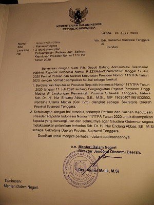 Ir. Joko Widodo, melalui Kementrian Dalam Negri (Kemendagri) melayangkan surat kepada Gubernur Sulawesi Tenggara, Ali Mazi dengan nomor surat : 800/3764/OTDA, tentang penyampaian pelantikan dan Salinan Keputusan Presiden Nomor 117/TPA Tahun 2020 tertanggal 21 Juli 2020 untuk menunjuk Nur Endang Abbas sebagai Sekertaris Daerah Proviinsi Sultra.
