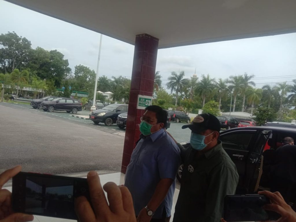 Salah satu oknum (kiri) diduga pemberi suap tiba di Kejati Sultra. Foto: Akbar Tanjung.