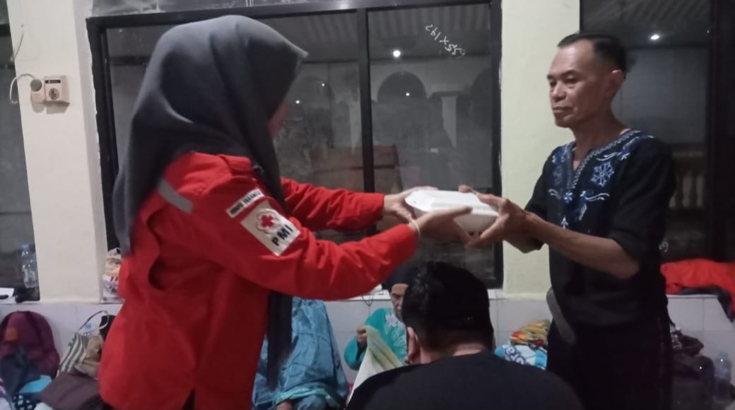 Tak hanya mengevakuasi, PMI Kota Makassar malam ini mendistribusikan makanan siap saji di posko pengungsian warga di Jalan Gunung Merapi.