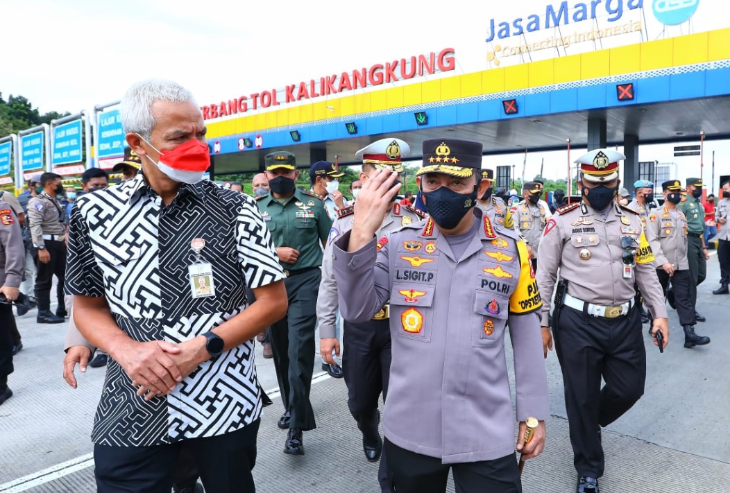 REPUBLIKNEWS.CO.ID, JAWA TENGAH — Kapolri Jenderal Listyo Sigit Prabowo bersama dengan Gubernur Jawa Tengah (Jateng) Ganjar Pranowo beserta stakeholder lainnya meninjau langsung Pos Terpadu Gerbang Tol Kalikangkung KM 414, untuk memastikan kesiapan pelayanan mudik Lebaran 2022.