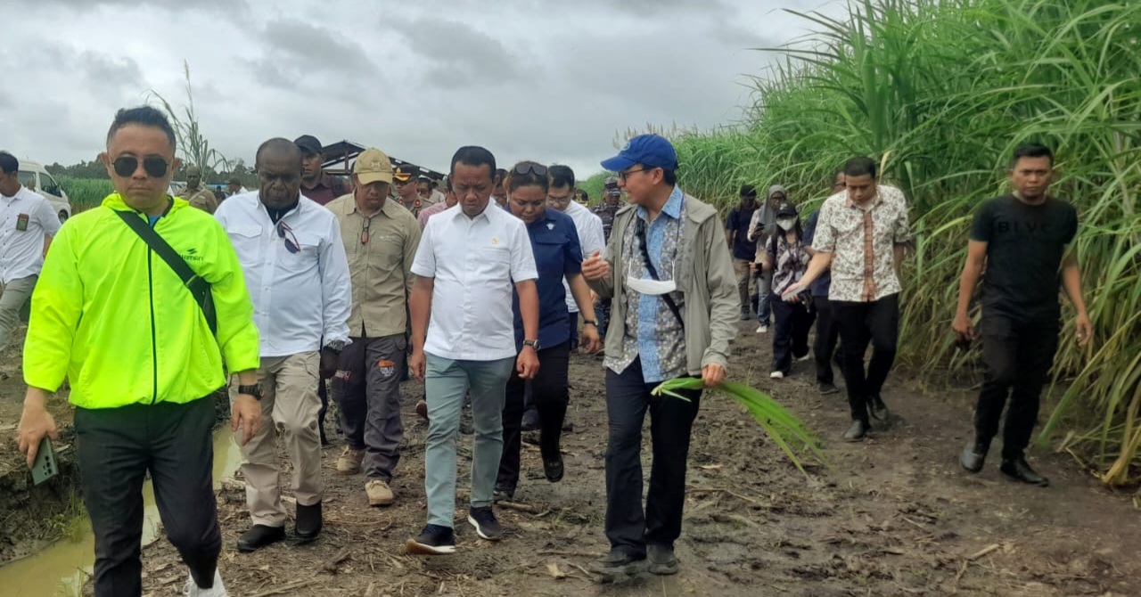 Peninjauan ke lahan perkebunan tebu, Menteri Bahlil Lahadalia didampingi Pj. Gubernur Papua Selatan Apolo Safanpo, Pj. Sekda Papua Selatan Maddaremmeng, Bupati Merauke Romanus Mbaraka dan pejabat di lingkup Kementerian Investasi/BKPM, Pemprov Provinsi Papua Selatan dan Pemkab Merauke.