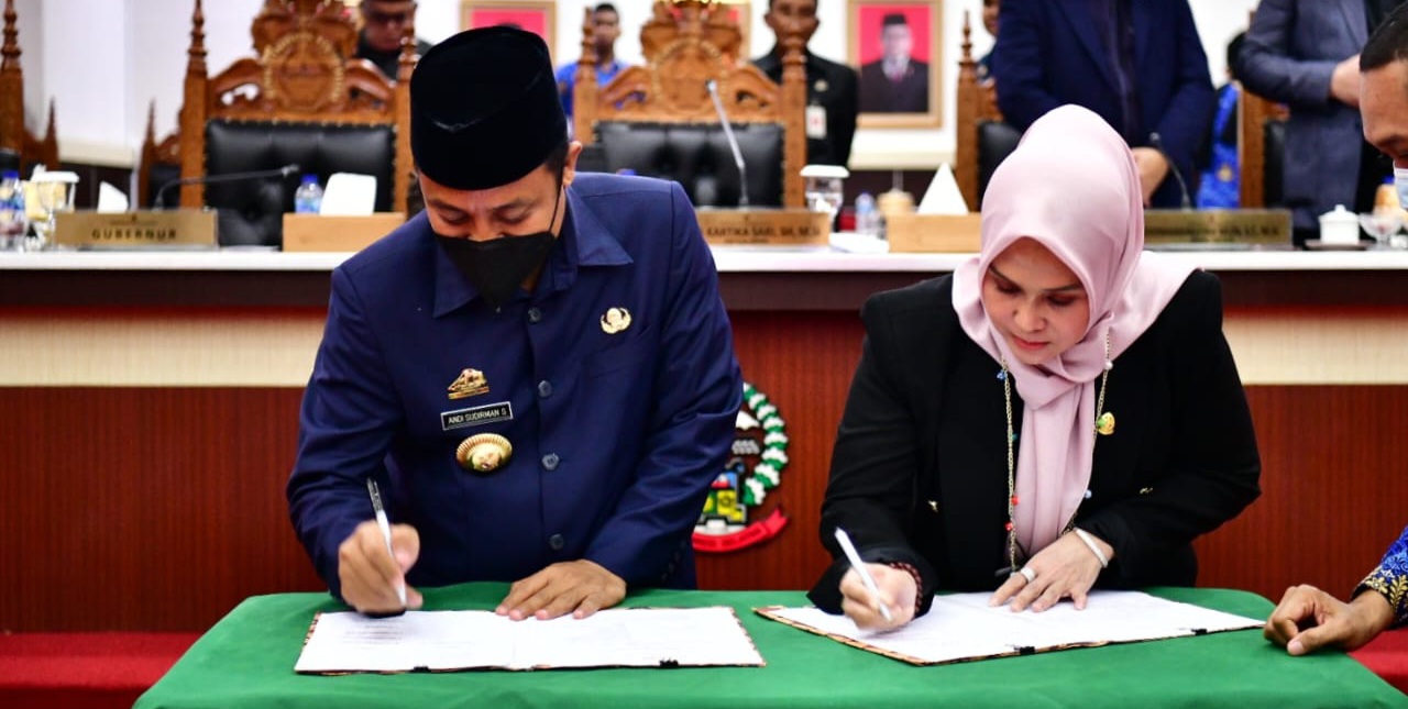 Hal itu ditandai penandatanganan oleh Ketua DPRD Sulsel, Andi Ina Kartika dan Gubernur Sulsel, Andi Sudirman Sulaiman di Ruang Rapat Paripurna Kantor DPRD Sulsel, Selasa (29/11/2022).