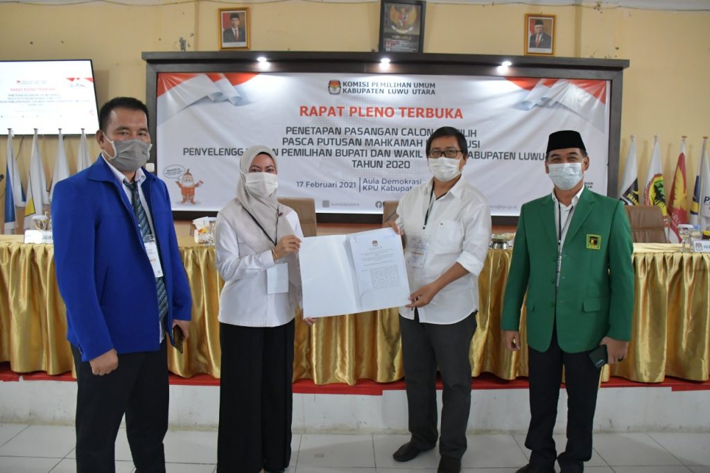 Komisi pemilihan umum (KPU) Luwu Uatara menggelar rapat pleno penetapan pasangan calon terpilih pada pemilihan bupati dan wakil bupati Luwu Utara tahun 2020. KPU secara resmi menetapkan pasangan nomor urut dua, Indah Putri Indriani – Suaib Mansur sebagai calon terpilih, Rabu (17/02/2021).