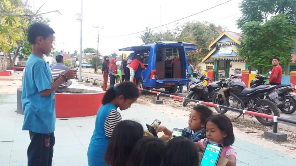 Terlihat, masyarakat mulai dari anak-anak hingga orang dewasa cukup antusias untuk datang membaca buku serta komik berbasis android yang disediakan Perpustakaan Keliling yang terparkir di Taman Kota, Kecamatam Mawasangka.