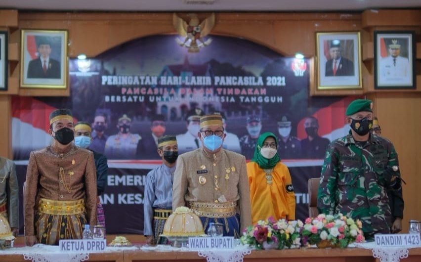REPUBLIKNEWS.CO.ID, SOPPENG — Upacara Hari Lahir Pancasila digelar secara virtual, Wakil Bupati Soppeng Luthfi Halide mengenakan jas ciri khas orang Bugis Soppeng di Ruang Pola Kantor Bupati Soppeng, Selasa (01/06/2021).