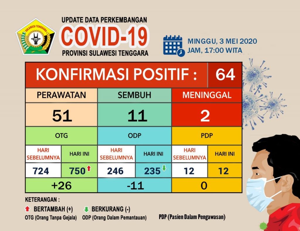 REPUBLIKNEWS.CO.ID, KENDARI — Pada Minggu (03/05/2020) Gugus Tugas Penanganan pencegahan Covid-19 Provinsi Sulawesi Tenggara (Sultra) mengumumkan Update Covid-19 Sultra.