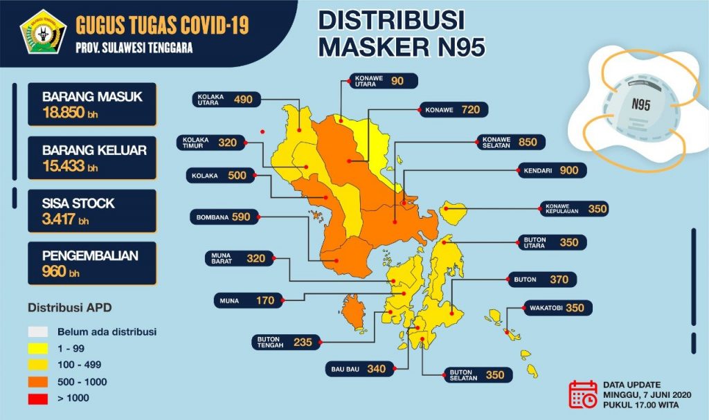 Berdasarkan data yang diumumkan Gugus Tugas Provinsi Sultra, jumlah stok masker yang ada sampai Minggu (07/06/20) adalah 18.850 buah dan yang sudah didistribusikan sejumlah 15.433 buah. Sisa stok masker yaitu 3.417 dan yang di kembalikan sehumlah 960 buah.