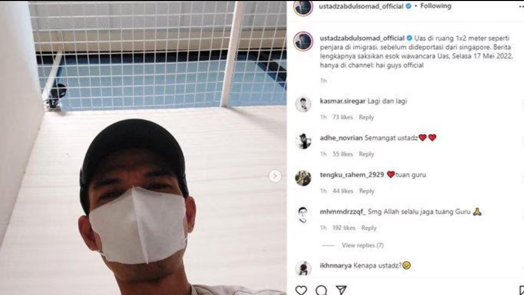 “UAS di ruang 1×2 meter seperti penjara di imigrasi, sebelum dideportasi dari Singapore,” demikian tulis UAS di akun instagramnya, Selasa (17/05/2022).