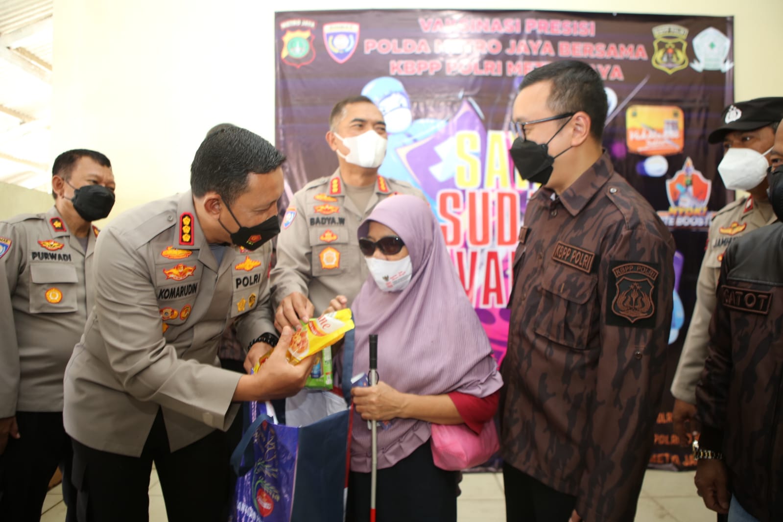 di Aspol Ciledug Kelurahan Sudimara Barat Kecamatan Ciledug Kota Tangerang turut hadir DirBimas Polda Metro Jaya (PMJ) Kombes Pol Badya Wijaya S.I.K, SH, MSi. dan Kapolres Metro Tangerang Kota Kombes pol Komarudin ,S.I.K.,M.M sekaligus memberikan bingkisan sembako secara simbolis kepada peserta Vaksin.