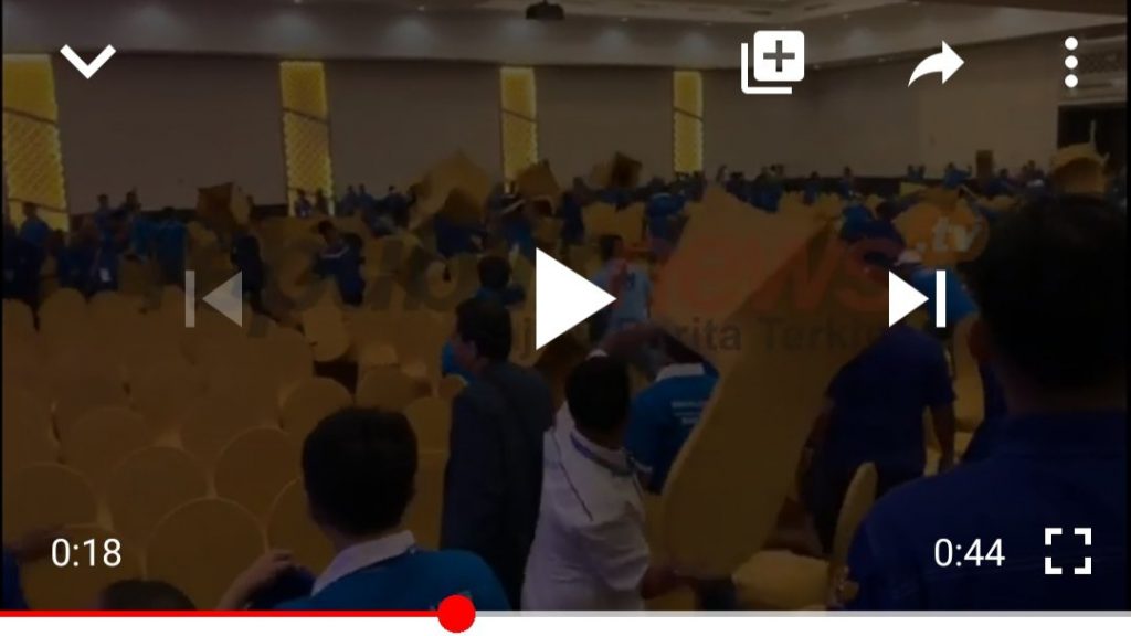 Seperti yang terlihat pada video berdurasi 37 detik yang tersebar di media sosial, ratusan pria menggunakan baju seragam Partai Berlambang Matahari itu saling lempar kursi di dalam Ruangan lokasi Kongres berlangsung.