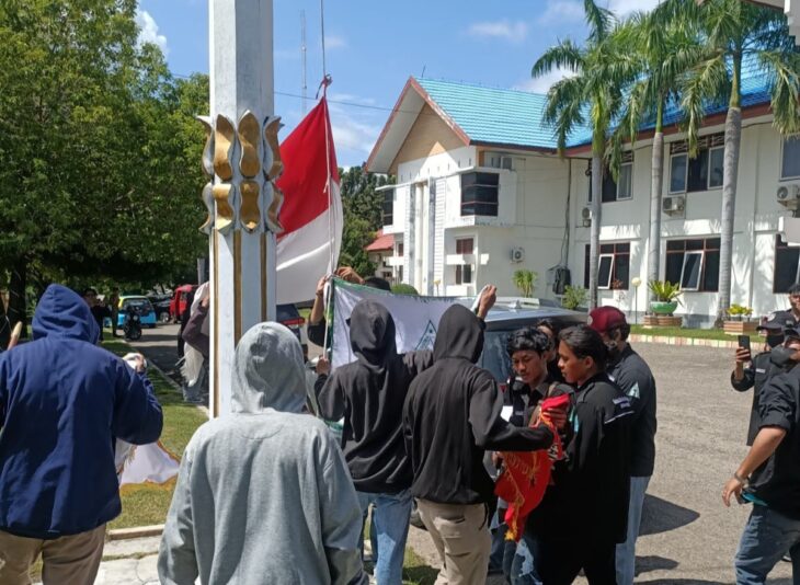 Informasi yang diterima, kronologis kejadian, awalnya massa datang dan naik ke depan Kantor Bupati, langsung menuju ke tiang bendera Merah Putih, seketika langsung membuka tali pengikat Bendera merah putih tersebut.
