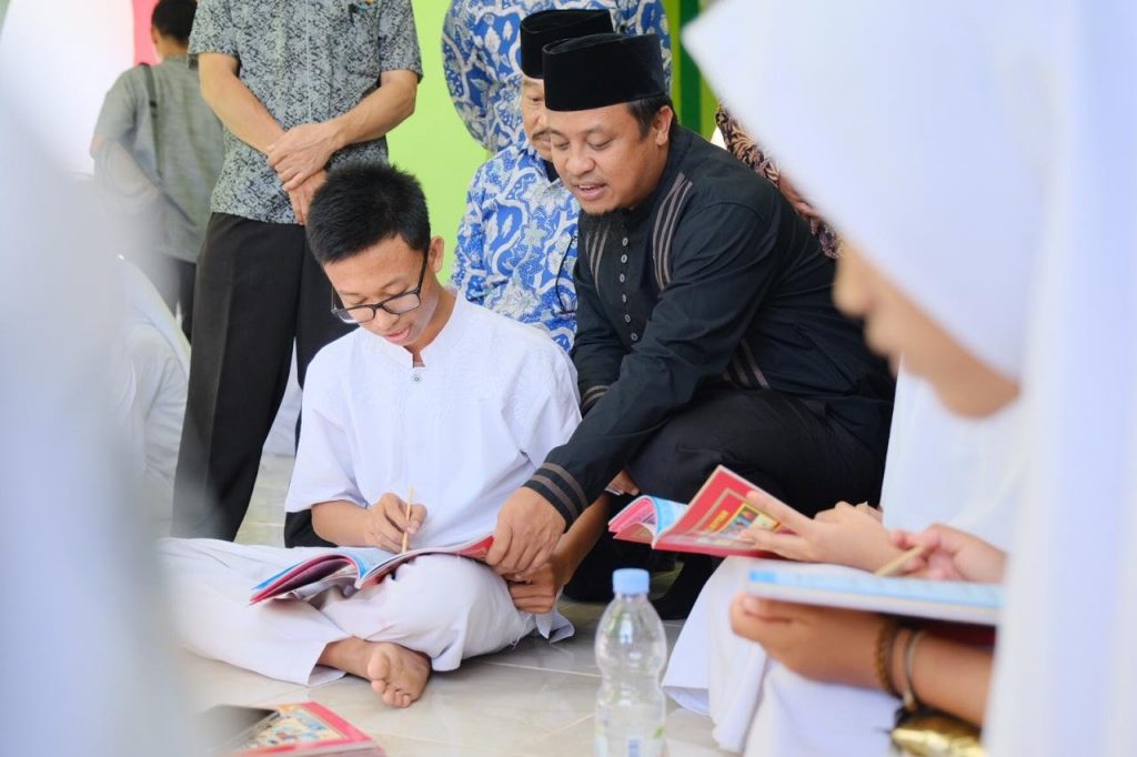 Wakil Gubernur Sulsel Andi Sudirman Sulaiman, menuntun salah satu siswa membaca Al-Quran, saat meresmikan Masjid Al-Qira'ah SMA Negeri 15 Makassar, Kecamatan Biringkanaya, Jumat (30/08/2019).