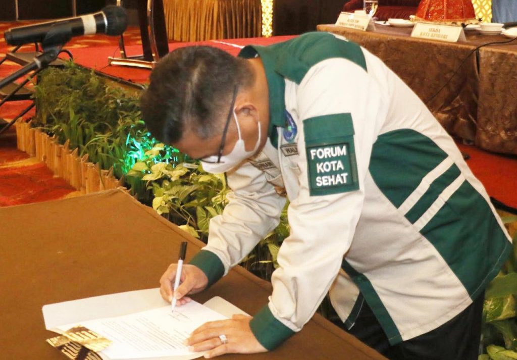 Wali Kota Kendari Zulkarnain, menandatangani Pengukuhan Forum Kota Sehat di Aula Hotel Claro Kendari, Selasa (06/10/2020).